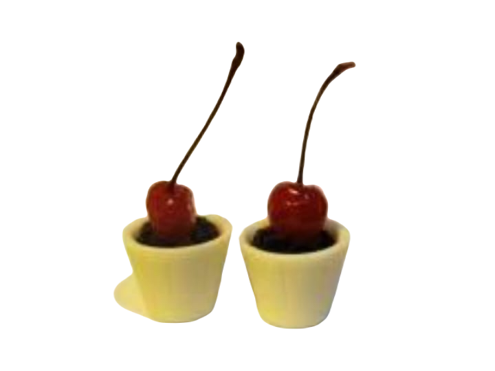 CAIXA COM 25 COPINHOS DE CHOCOLATE BRANCOS PRONTOS RECHEADOS E DECORADOS COM 25 CEREJAS COM TALINHOS